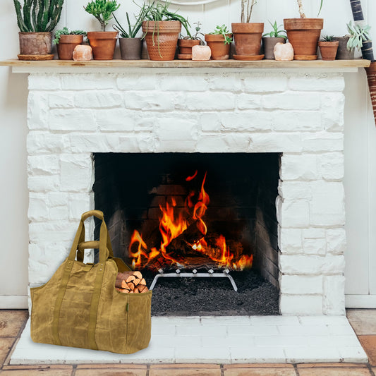 Woodside Firewood Log Carrier Bag, Heavy Duty Waterproof Waxed Canvas with Padded Handles & Pocket