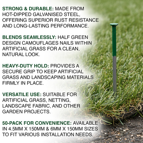 Secure your artificial grass with the Woodside Half Green Heavy Duty Artificial Grass Nails. This 50-pack of high-quality galvanised steel nails ensures a firm and lasting hold. Designed with a half green coating, they blend seamlessly into your lawn for a neat finish. Choose between 4.5mm x 150mm or 6mm x 150mm sizes to suit your needs. These heavy-duty nails are also ideal for securing landscape fabric, netting, and other outdoor projects.
