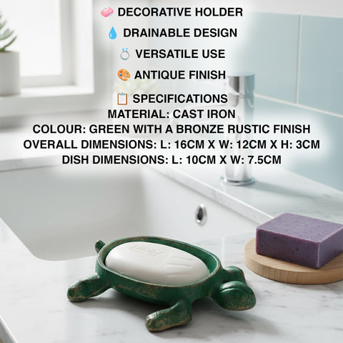 SPECS – Overall Length: 16cm x Overall Width: 12cm x Height: 3cm. Dish Length: 10cm x Dish Width: 7.5cm. Material: Cast Iron. Colour: Green with a bronze rustic finish